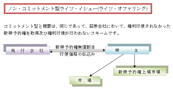 これに対して、ライツ・イシュー(ライツ・オファリング・株主割当増資)は、既存の株主に対して、新株予約権を無償で割当てる方法です。自社の株主に対してさらなる出資を求める方法です。ライツ・イシューのスキームとしては、2種類があります。コミットメント型ライツ・イシュー(ライツ・オファリング)と、ノン・コミットメント型ライツ・イシュー(ライツ・オファリング)です。